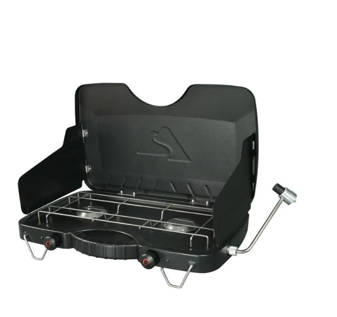 - Dual-burner propane stove is suitable for use when camping or without electricity