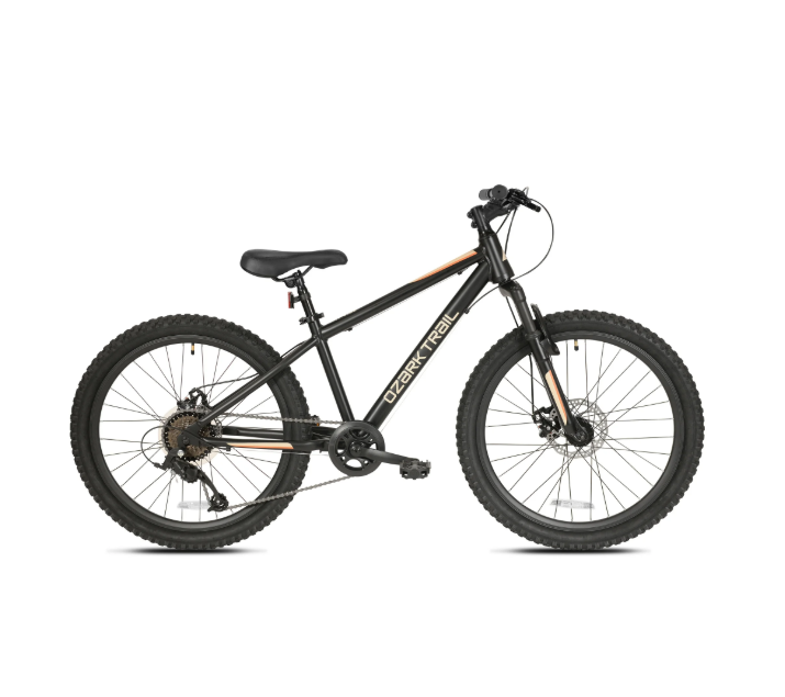 - Ozark Trail 24″ Youth Vibe Aluminum Mountain Bicycle, 8 Speeds, Front Suspension, Dual Disc Brakes, Black