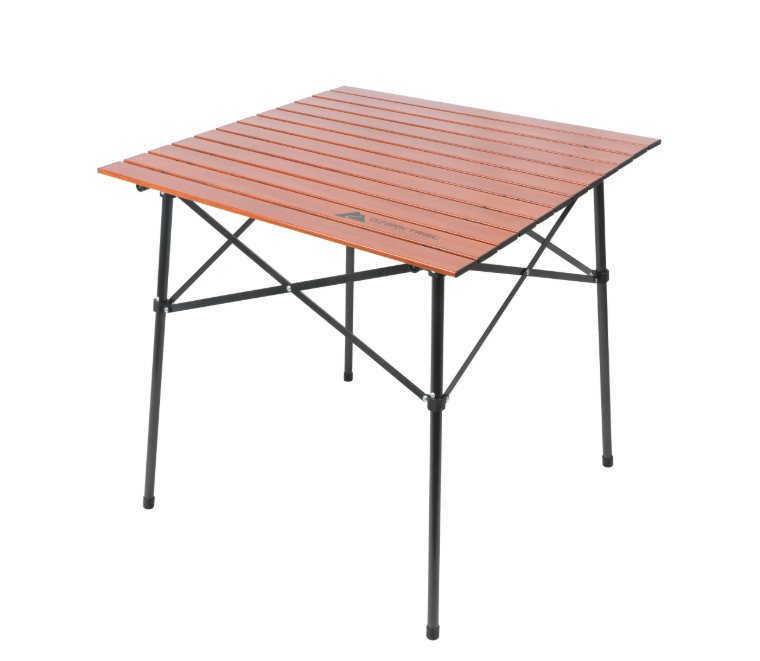 - Ozark Trail Hazel Creek Square Folding Aluminum Roll-Top Camp Table, Wood Tone Finish