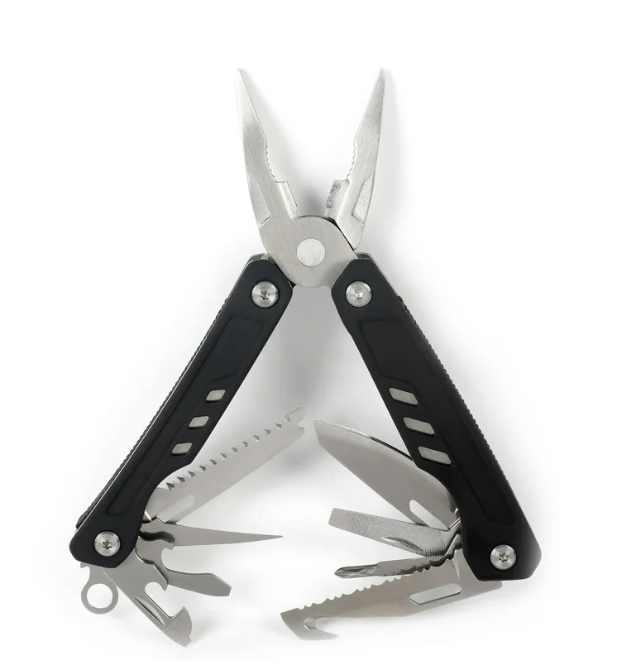 • Tool includes long-nose and standard pliers, wire cutter, medium and large slotted screwdriver, Phillips screwdriver, bottle opener, can opener, saw, knife, ruler, fish scaler, hook remover, two files, awl, and keychain