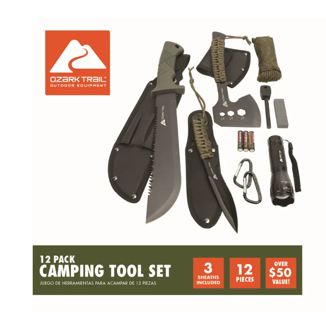 Ozark Trail Camping Tool Set, 12 Piece, Includes Flashlight, Machete, Knife, Outdoor Gear Kit